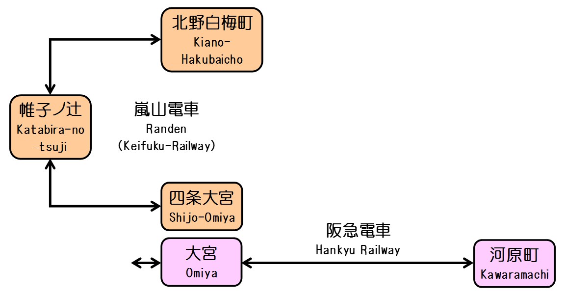 まず河原町からの場合は以下のような乗り換えが必要になります。
