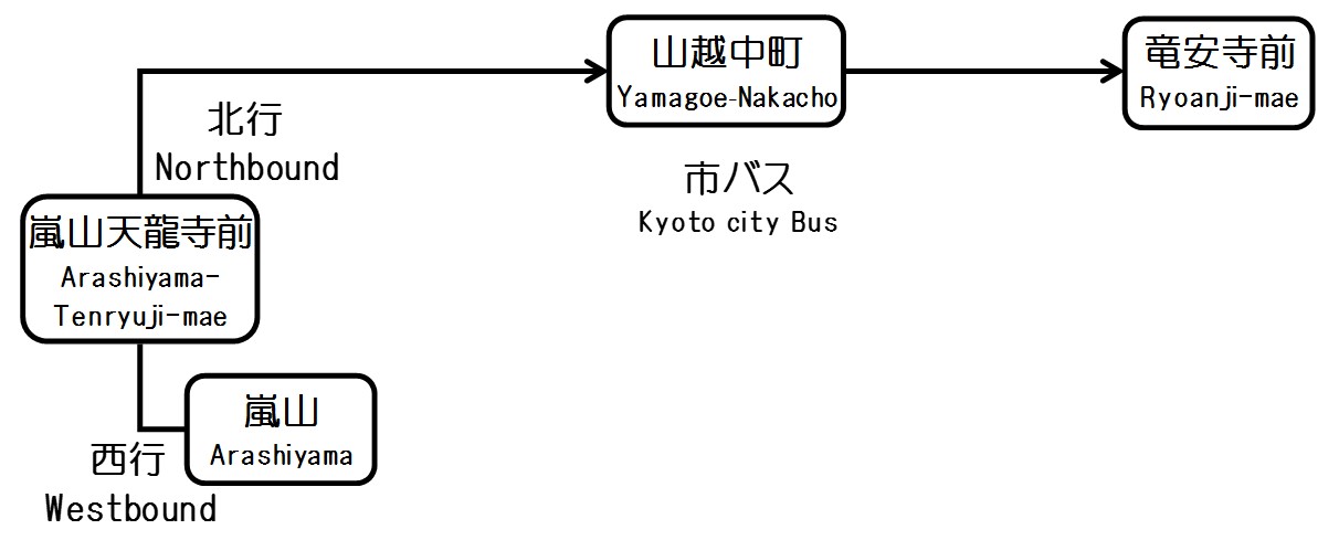 また嵐山から龍安寺へバスを乗り継いで向かう場合には、以下のような乗り換えが必要になります。